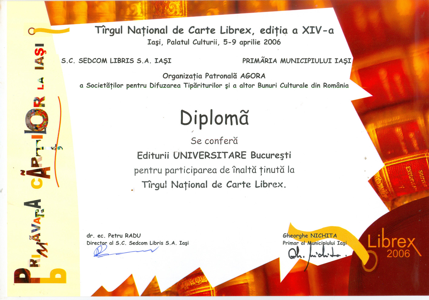 Diploma pentru participarea de inalta tinuta (Targul National de Carte Librex, editia a XIV-a, Iasi, 5-9 aprilie 2006)
