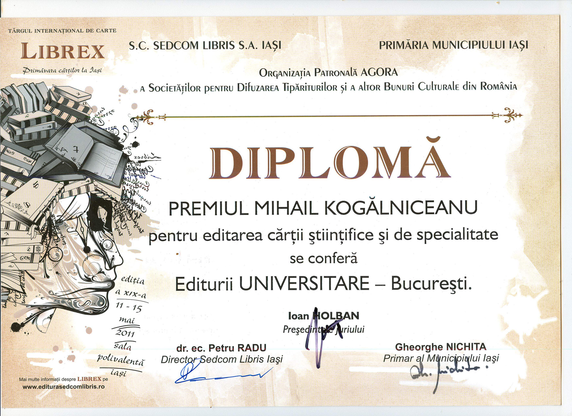 Premiul „Mihail Kogalniceanu” pentru editarea cartii stiintifice si de specialitate (Targul International de Carte Librex, editia a XIX-a, Iasi, 11-15 mai 2011)